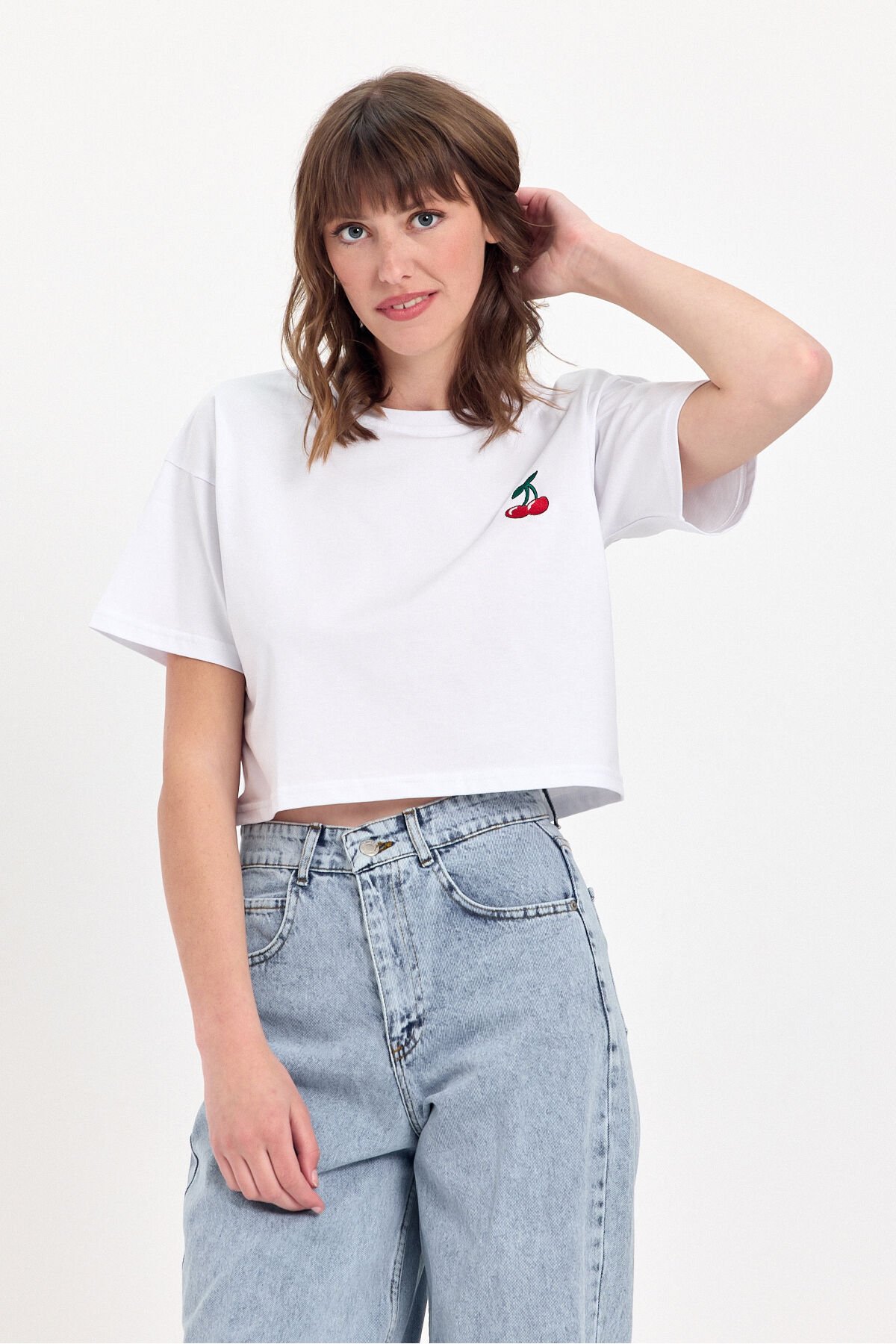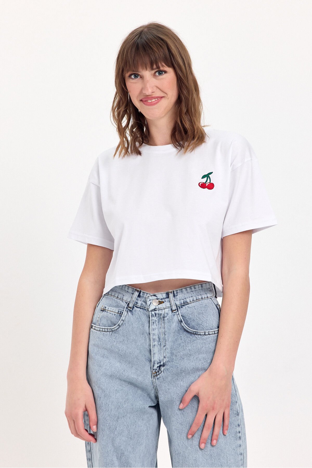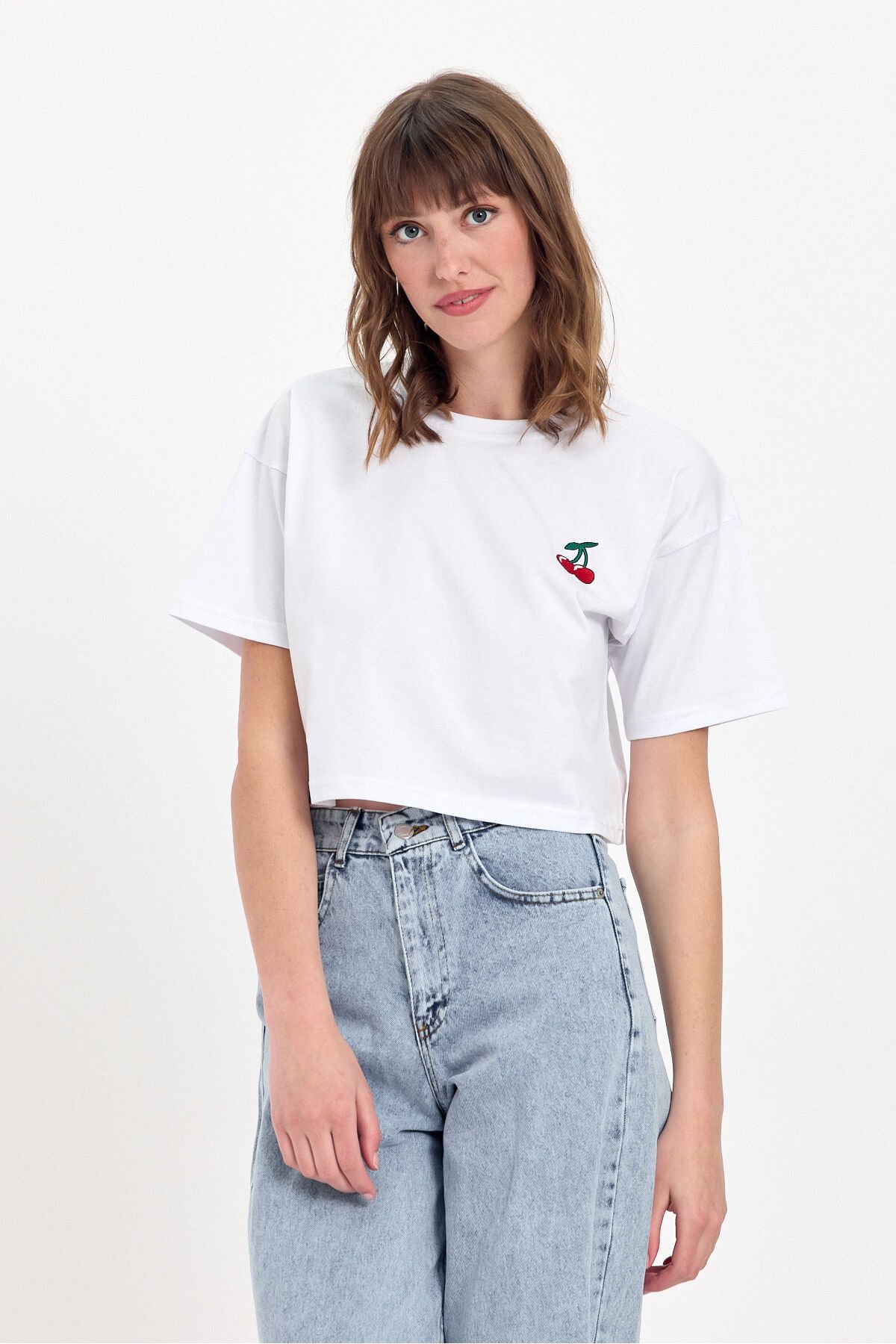 - %100 pamuk kumaştan üretilmiş olup, cildinizle dost dokusuyla gün boyu konfor sunar.; - Kiraz nakış detayları ile genç ve dinamik bir görünüm kazandırırken, stilinizi öne çıkarır.; - Relaxed kalıp sayesinde rahat hareket etme özgürlüğü sağlar; ne çok dar ne de çok bol, tam size göre.; - Crop boy kesimi ile modern ve şık bir siluet oluştururken, günlük kullanım için idealdir.; - Kısa kollu tasarımı yaz aylarında serinlik ve rahatlık sunarken, bisiklet yaka detayı ile sade bir şıklık katmaktadır.; - Düşük kol tipi sayesinde omuzlarınızda rahatlık hissi yaratırken, casual ortamlarda rahatça tercih edebilirsiniz.; - Casual giyimin vazgeçilmez parçası olarak günlük kombinlerinizde kolayca uyum sağlar; her tür alt giyimle mükemmel bir uyum sergiler.; - İşlemeli deseniyle göz alıcı detaylara sahip olup, gardrobunuzda farklılık yaratmanız için idealdir.