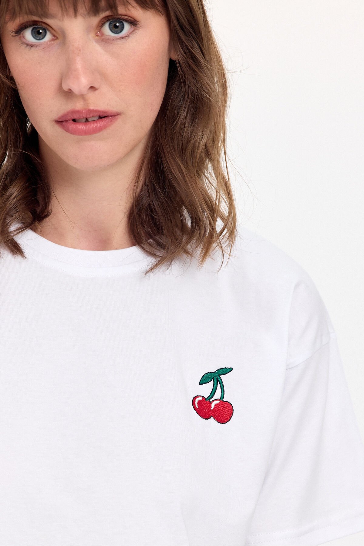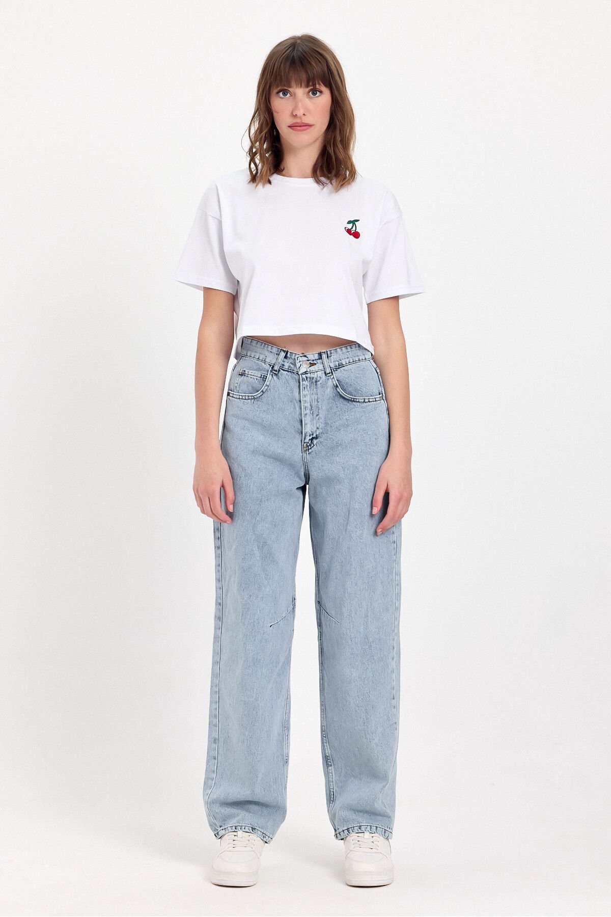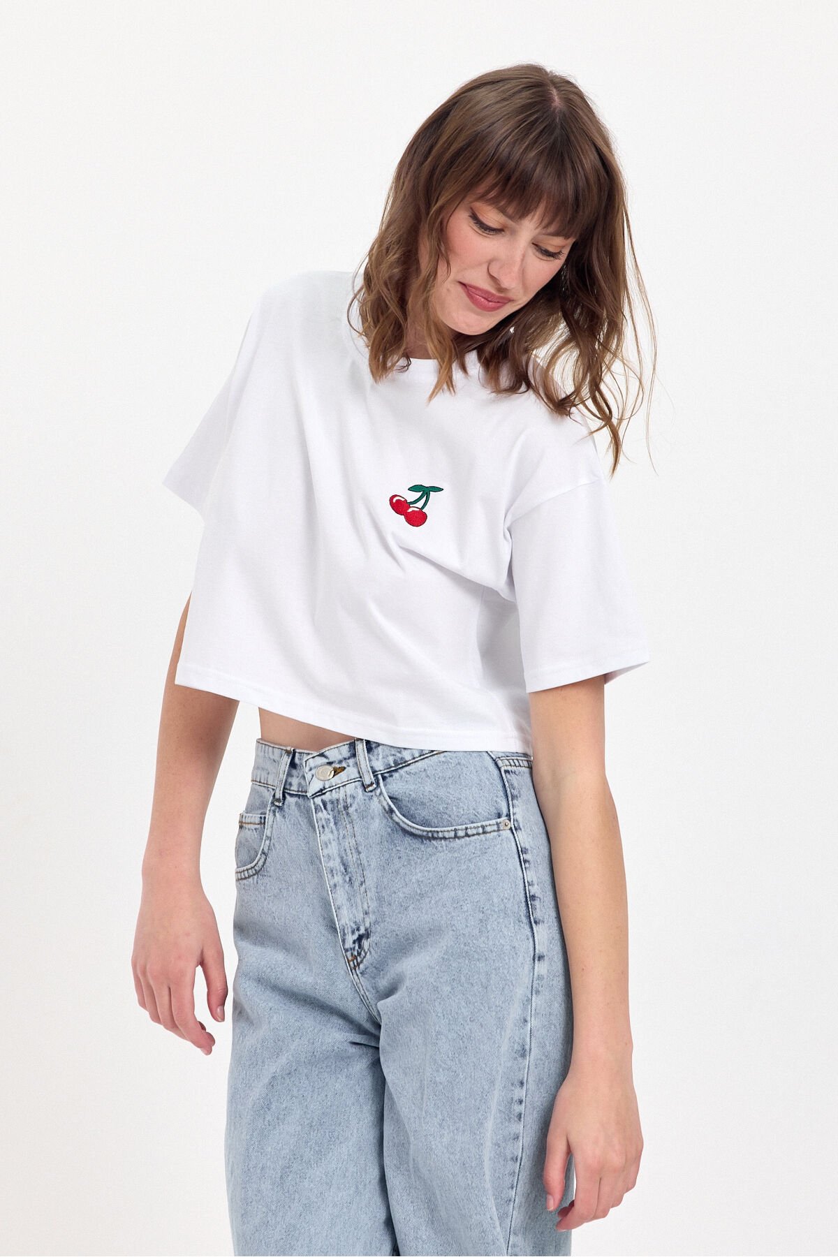 - %100 pamuk kumaştan üretilmiş olup, cildinizle dost dokusuyla gün boyu konfor sunar.; - Kiraz nakış detayları ile genç ve dinamik bir görünüm kazandırırken, stilinizi öne çıkarır.; - Relaxed kalıp sayesinde rahat hareket etme özgürlüğü sağlar; ne çok dar ne de çok bol, tam size göre.; - Crop boy kesimi ile modern ve şık bir siluet oluştururken, günlük kullanım için idealdir.; - Kısa kollu tasarımı yaz aylarında serinlik ve rahatlık sunarken, bisiklet yaka detayı ile sade bir şıklık katmaktadır.; - Düşük kol tipi sayesinde omuzlarınızda rahatlık hissi yaratırken, casual ortamlarda rahatça tercih edebilirsiniz.; - Casual giyimin vazgeçilmez parçası olarak günlük kombinlerinizde kolayca uyum sağlar; her tür alt giyimle mükemmel bir uyum sergiler.; - İşlemeli deseniyle göz alıcı detaylara sahip olup, gardrobunuzda farklılık yaratmanız için idealdir.