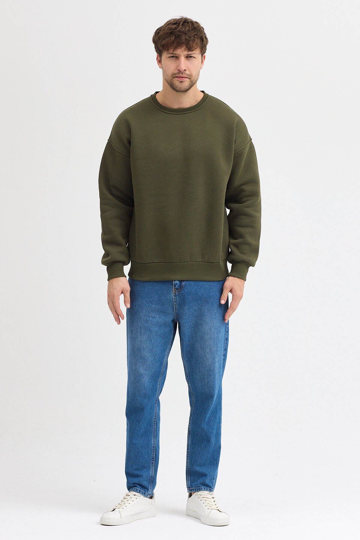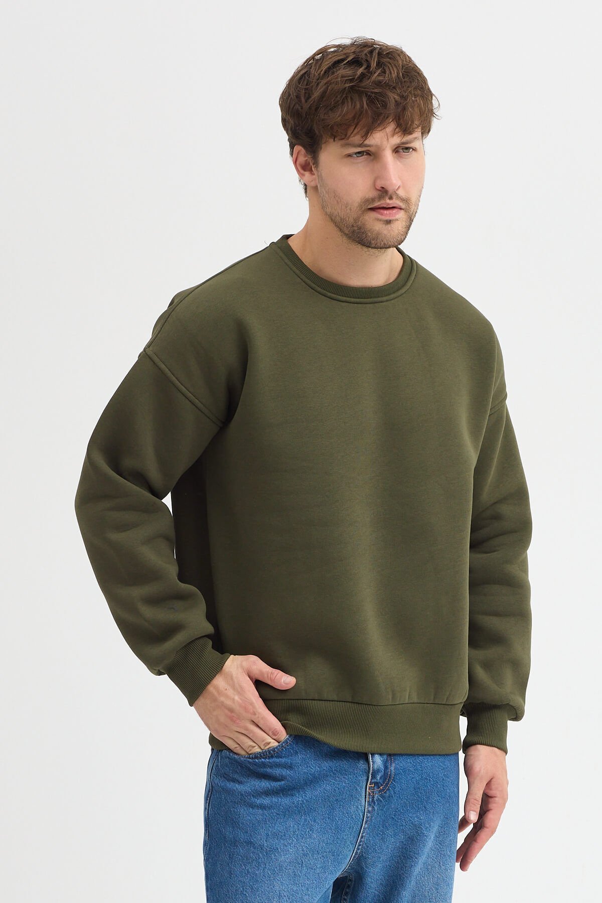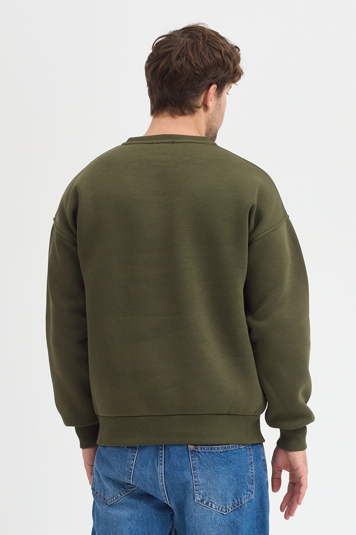 Haki Bisiklet Yaka Oversize Şardonlu Basic Erkek Sweatshirt