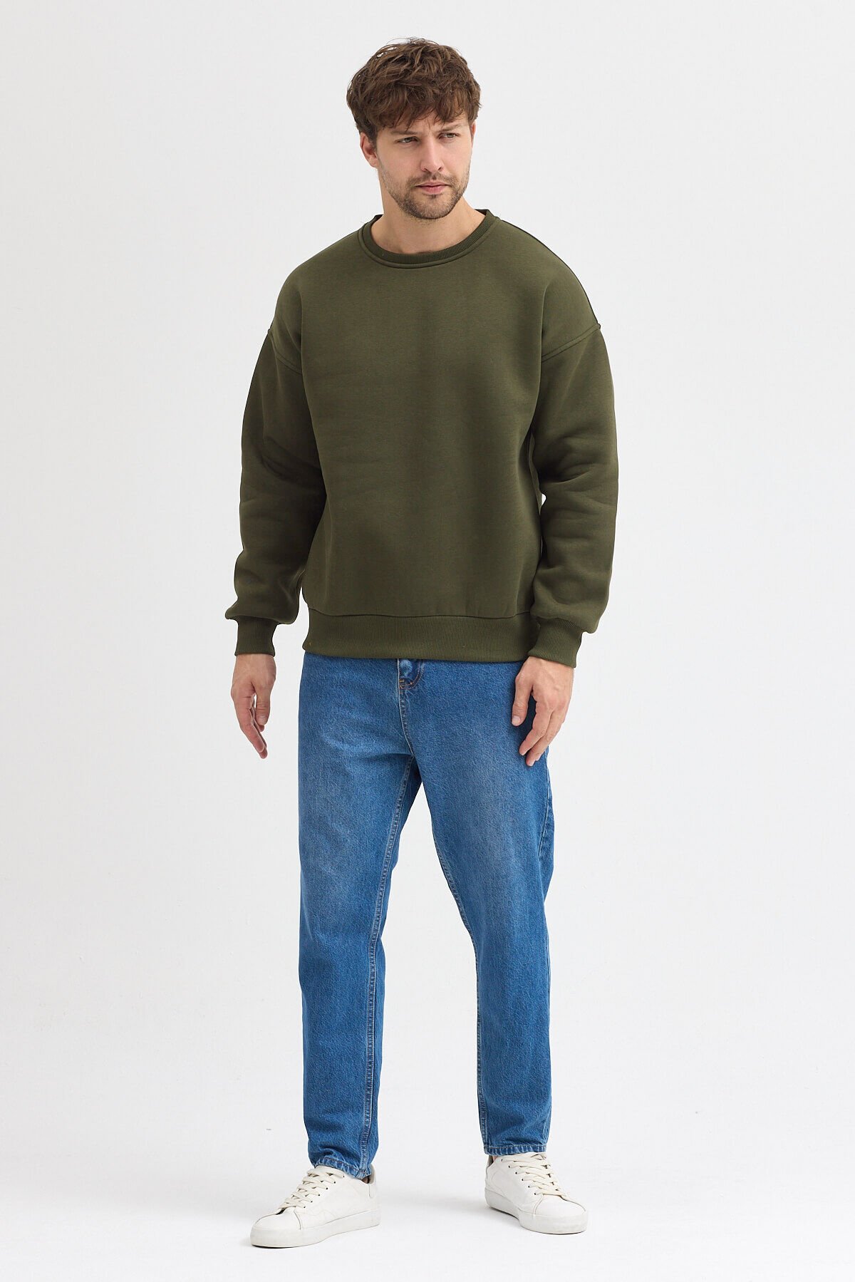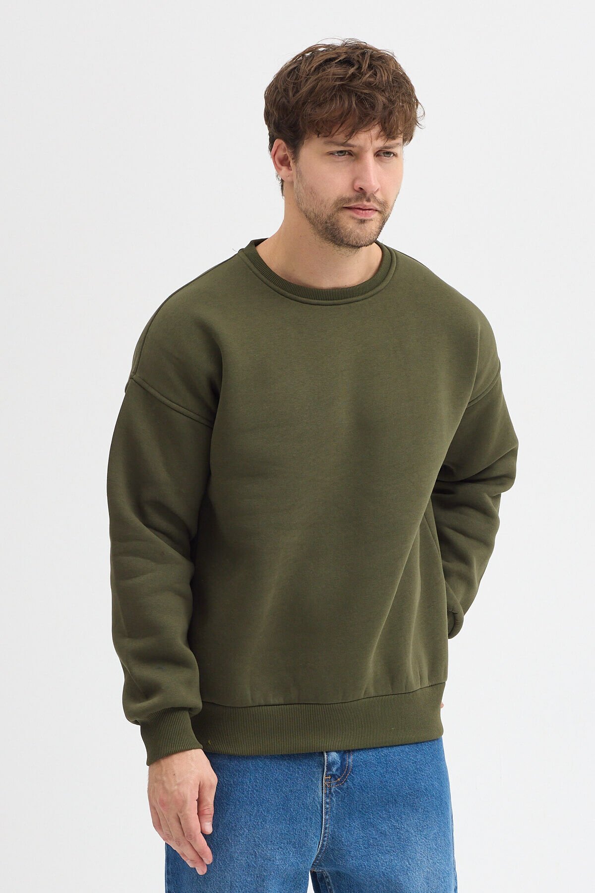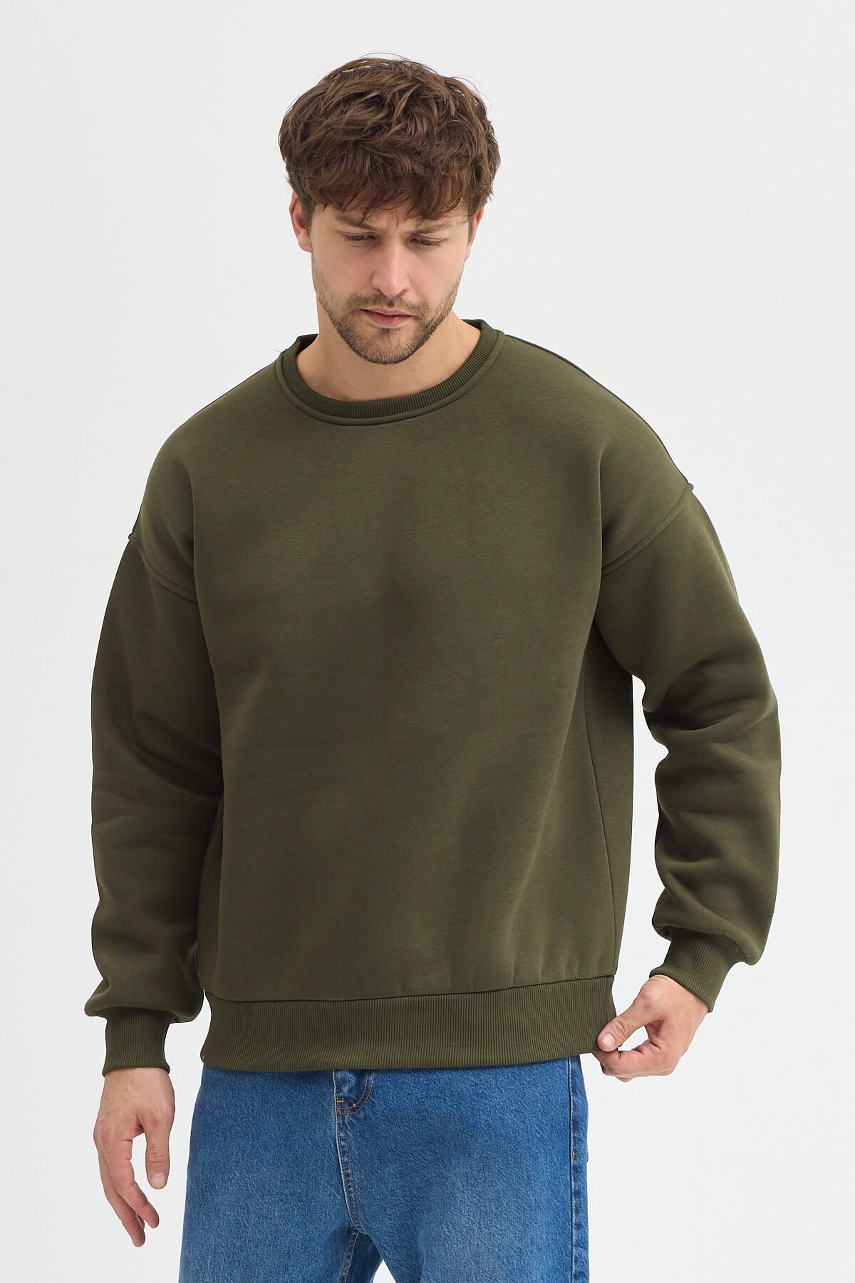 Haki Bisiklet Yaka Oversize Şardonlu Basic Erkek Sweatshirt