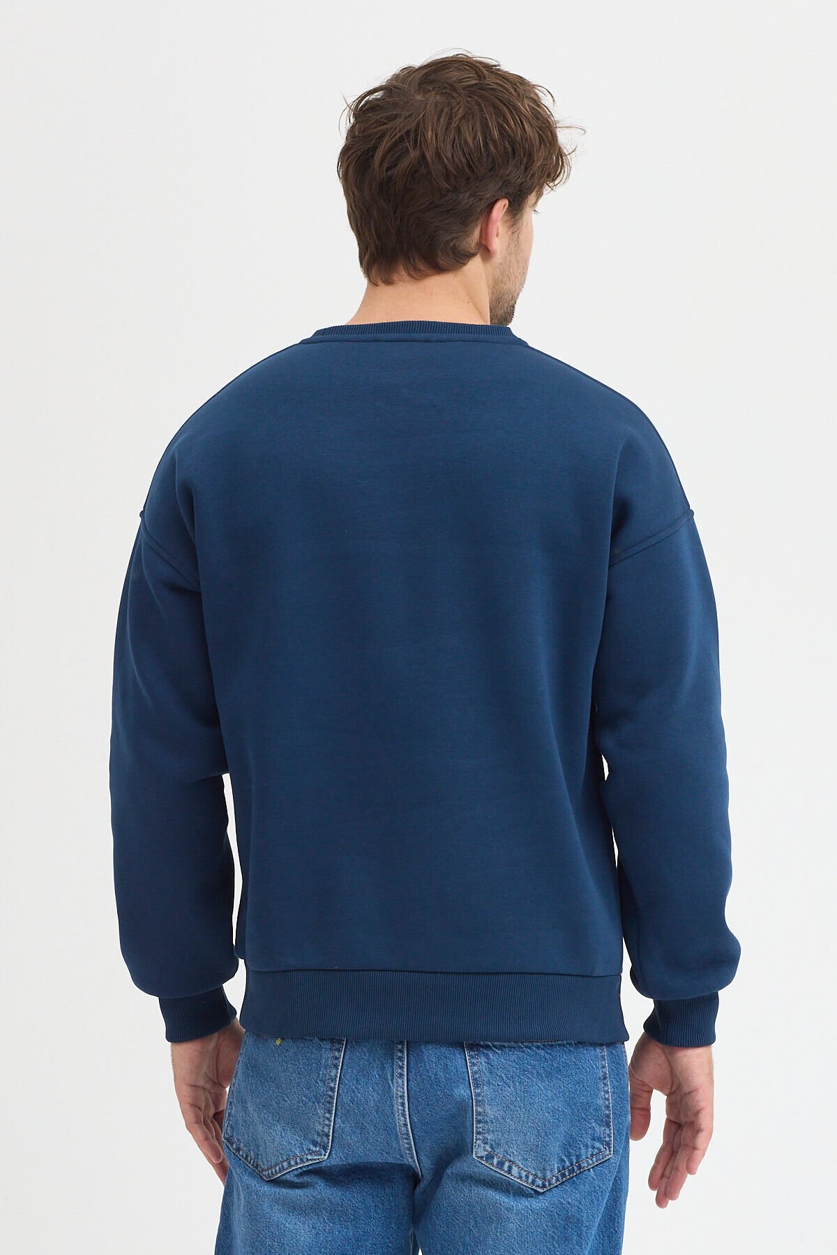 Nakışlı İndigo Bisiklet Yaka Oversize Şardonlu Basic Erkek Sweatshirt
