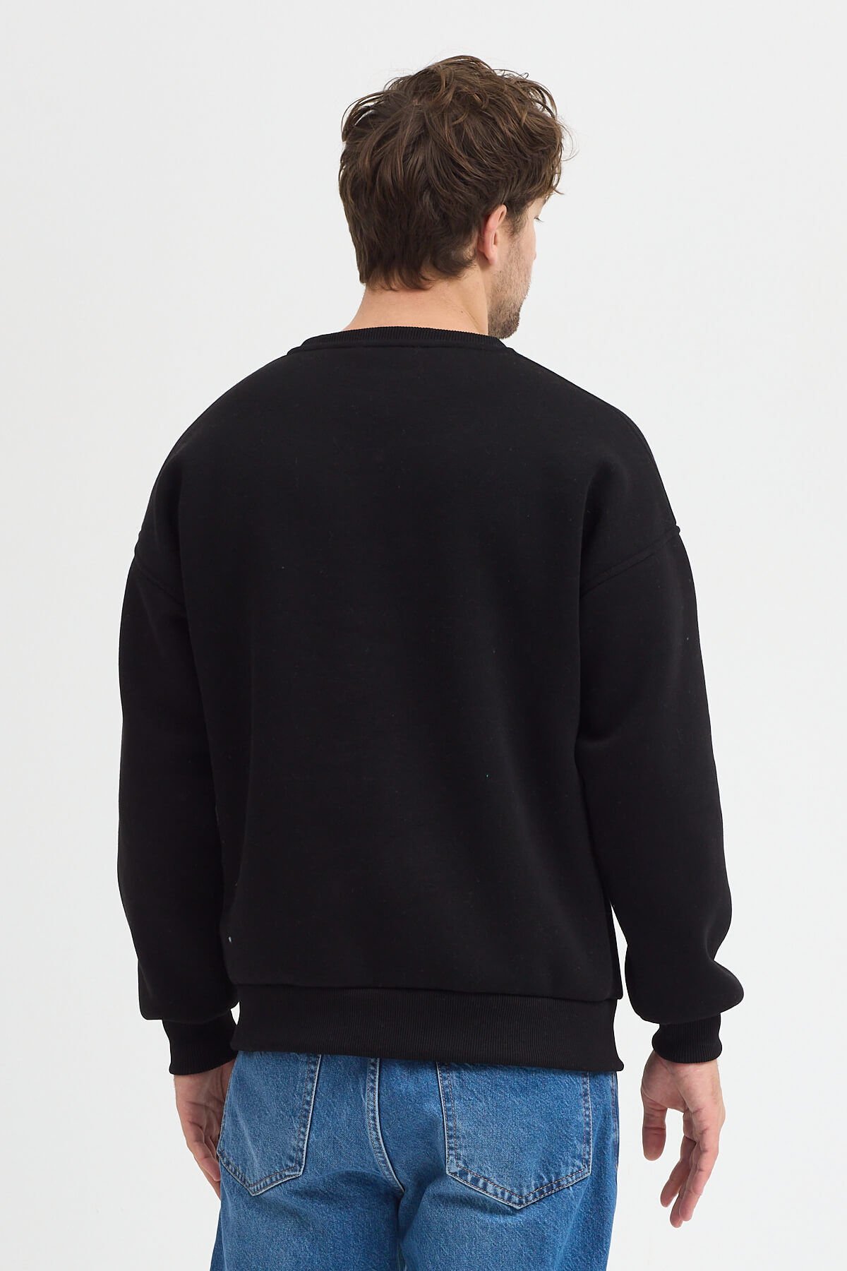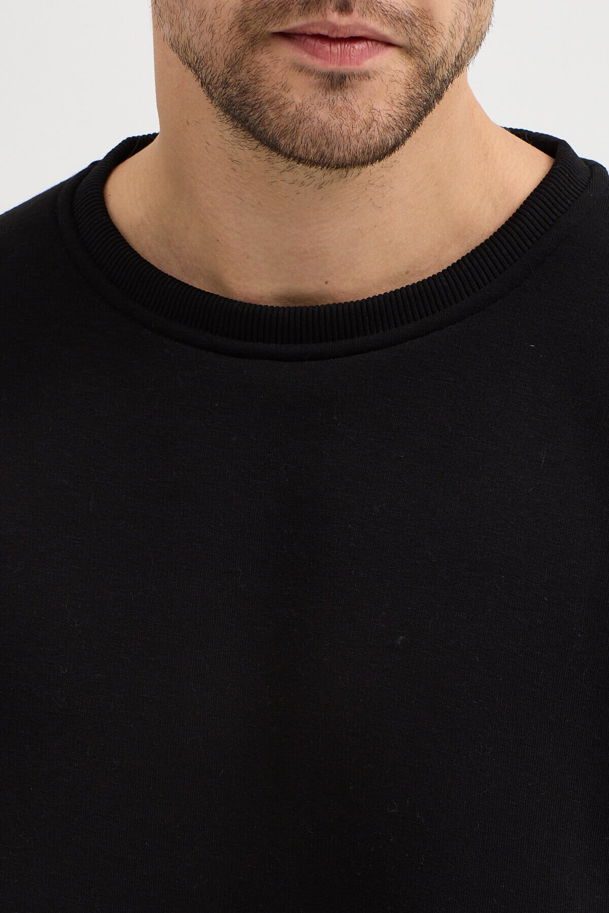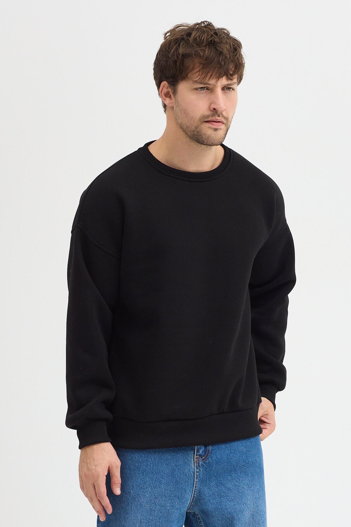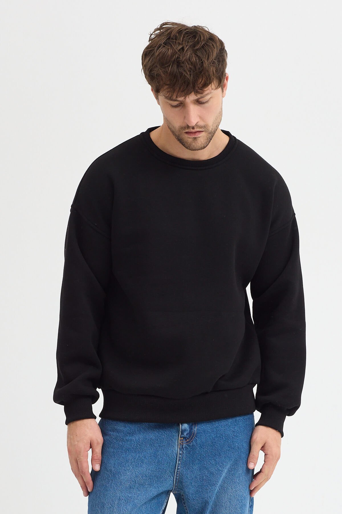Siyah Bisiklet Yaka Oversize Şardonlu Basic Erkek Sweatshirt